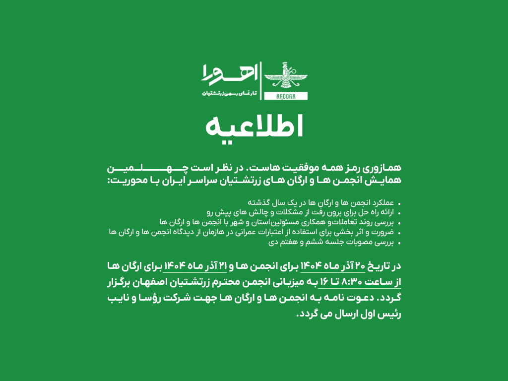 چهلمین همایش انجمنها و ارگانهای زرتشتیان سراسر ایران بررسی عملکرد، چالشها و راهکارهای توسعه در جامعه زرتشتی – ۲۰ و ۲۱ آذر ۱۴۰۴ در اصفهان به یاری اهورامزدا 🌿 همازوری، رمز همه موفقیتهاست. دور بیستوچهارم همایش انجمنها و ارگانهای زرتشتیان سراسر ایران با هدف همافزایی و بررسی راهکارهای توسعه اجتماعی و فرهنگی برگزار میشود. این همایش در روزهای ۲۰ آذر ۱۴۰۴ (ویژه انجمنها) و ۲۱ آذر ۱۴۰۴ (ویژه ارگانها) از ساعت ۸:۳۰ تا ۱۶ به میزبانی انجمن زرتشتیان اصفهان برگزار خواهد شد. محورهای اصلی همایش عملکرد انجمنها و ارگانها در یک سال گذشته ارائه راهکار برای برونرفت از مشکلات و چالشهای پیشرو بررسی روند تعامل و همکاری مسئولان استانها و شهرها با انجمنها و ارگانها ضرورت و اثربخشی استفاده از اعتبارات عمرانی در هازمان از دیدگاه انجمنها و ارگانها بررسی مصوبات جلسه ششم و هفتم دیماه ۱۴۰۳ دعوتنامه رسمی این همایش برای حضور رؤسا و نایبرؤسای اول انجمنها و ارگانهای زرتشتی ارسال خواهد شد. هدف نهایی این نشست، تقویت همازوری، تبادل تجربه و برنامهریزی دقیق برای رشد پایدار جامعه زرتشتیان ایران است.